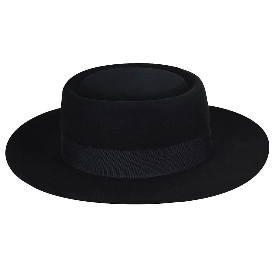 A stiff blocked pork pie hat from Bailey, the Walsh Polished Wide Brim Wool Felt Pork Pie Hat is a sharp addition to their already stellar line of headwear. This is a contemporary take on a classic pork pie with a wider brim and a flatter, telescope crown that gives the hat an overall more oval shape. The 3″ flat ‘tabletop’ brim features a raw edge while the crown is adorned with a grosgrain ribbon hat band and vintage flooring nail.