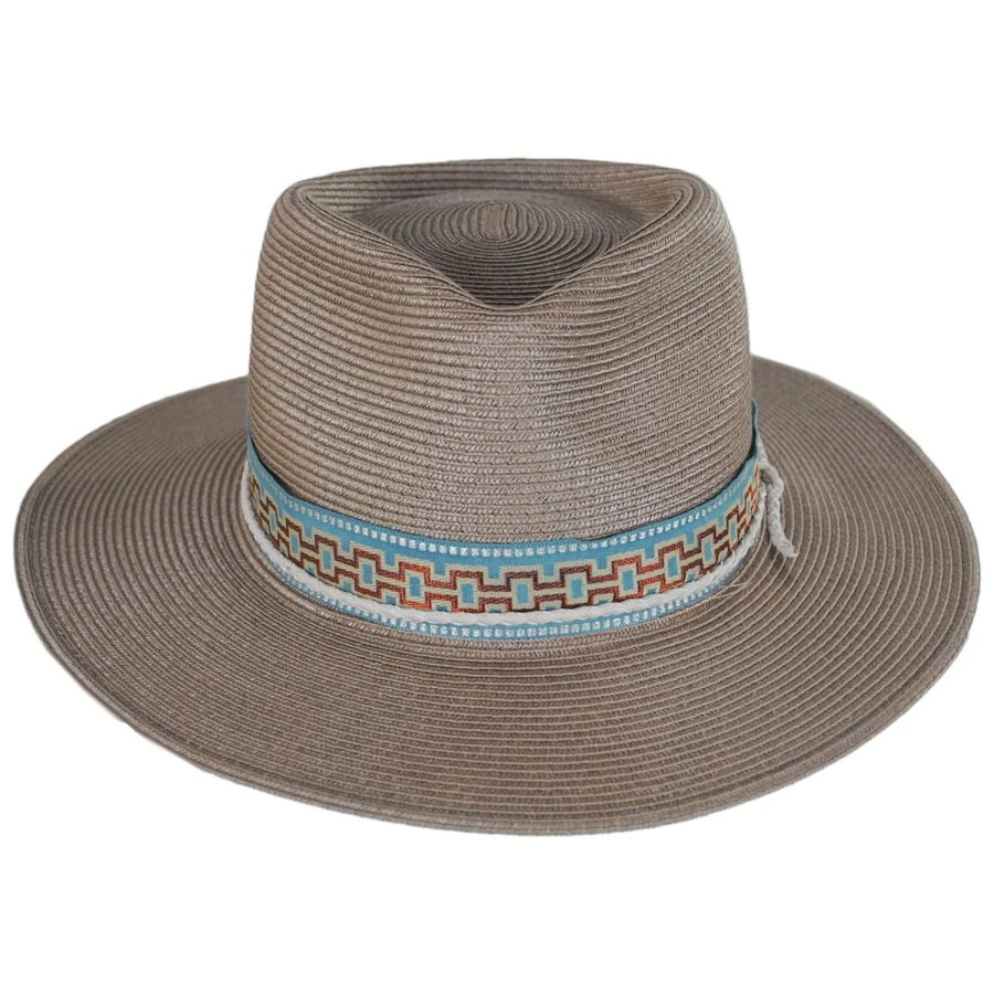 Glimmer and shine in the Marcos Braided Straw Fedora Hat by Goorin Bros! Woven from a straw-like material that has been finished with a metallic shine, the Marcos also features a layered hat band of patterned ribbon and braided faux leather band that is finished in a tie. The interior is unlined with an absorbent, cotton twill sweatband.