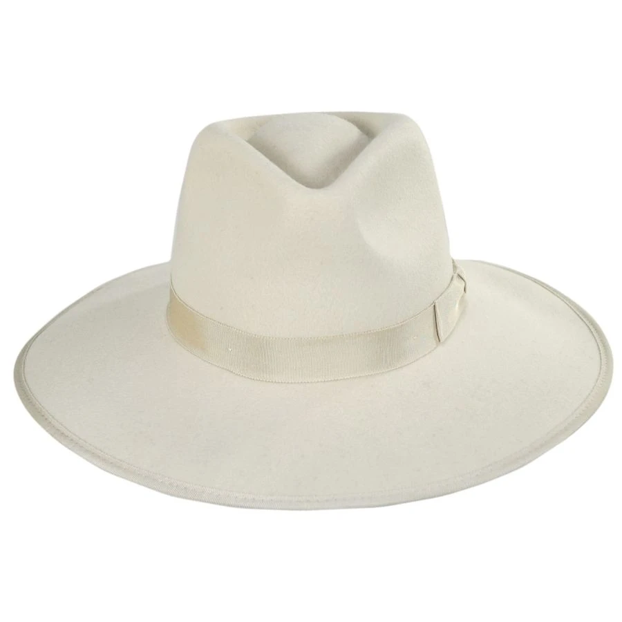 Made from wool that meets the Responsible Wool Standard for sustainability, the Jo Wool Felt Rancher Fedora Hat – Ivory by Brixton Hats is a classic, sharp fedora with a grosgrain ribbon hat band and binding on the brim. With a first-rate look and feel thanks to the felt finish, the fine design of the Jo includes a wide brim, teardrop crown, cotton twill sweatband and interior adjustable velcro strap for the perfect fit. An easy pair with any outfit!
