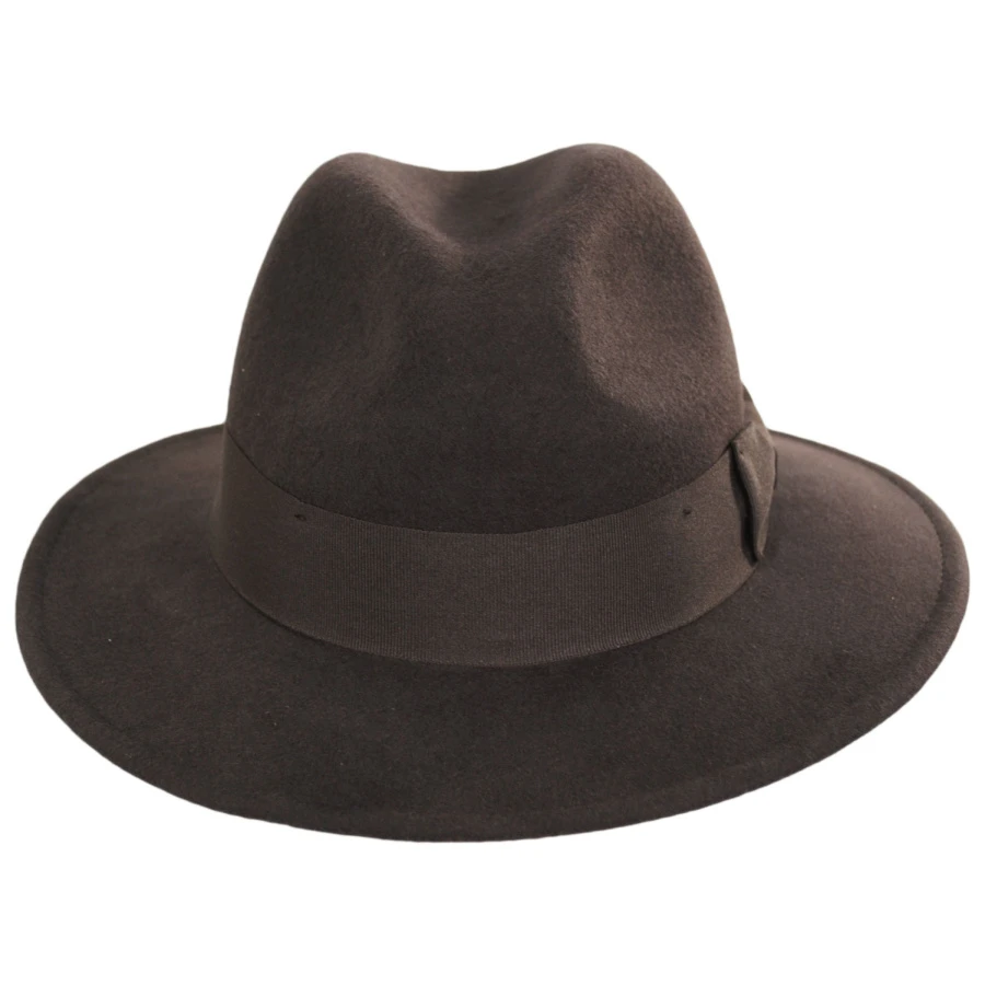 This is the official, licensed, water repellent, wool felt crushable version of the Indiana Jonesâ„¢ hat. The hat Crushable Wool Felt Safari Fedora Hat features a grosgrain ribbon hat band with side bow, Indiana Jonesâ„¢ side pin and branded sweatband. Enjoy the look of the famous hat in a packable design perfect for travel and adventure.
