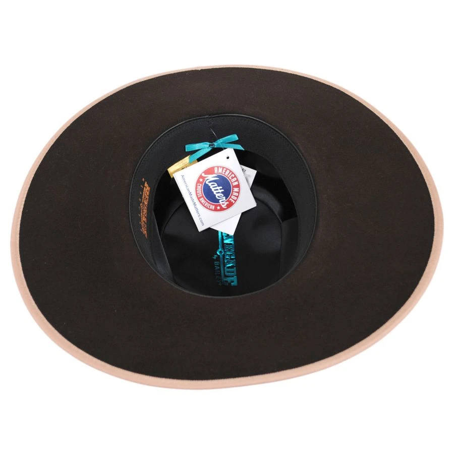 A standout piece, made by the always fashionable and chic, Renegade by Bailey, the Cowpuncher Wool and Angora Felt Gambler Hat. Crafted from soft angora and wool with a felt finish, this ultra-trendy look also features an extra wide grosgrain ribbon hat band, antique copper star concho accent and grosgrain ribbon binding on the brim. Take your boho western aesthetic to the next level!