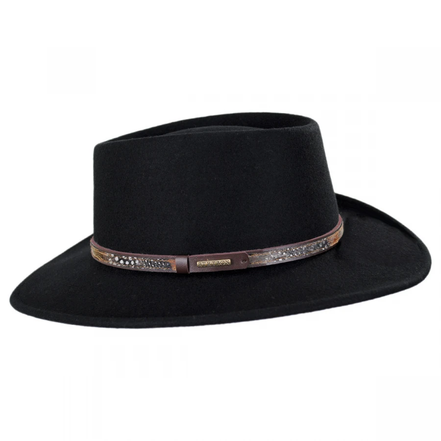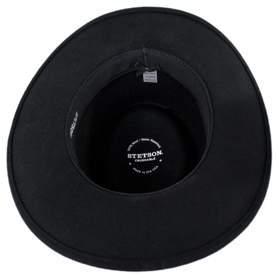The Stetson Kelso Crushable Wool Felt Gambler Western Hat features a gambler-style crown crafted of crushable wool felt. Adorned with a faux leather hat band overlaid with feathers, the Kelso is finished with a Stetson metal side pin, slightly curved brim and absorbent DRI-LEX® sweatband. Its crushable (i.e. packable) nature makes this a great outdoor style while it also boasts the additional benefit of being water repellent.