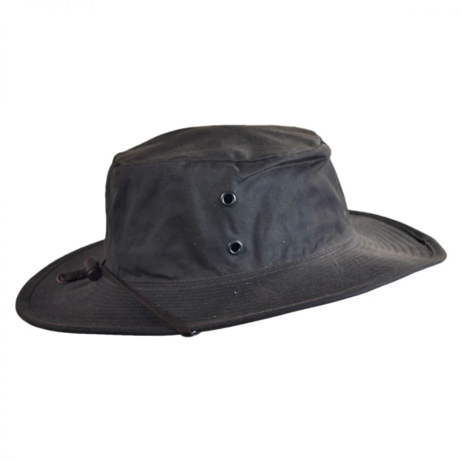 The Squatter Waxed Cotton Booney Hat features genuine Australian oilskin (waxed cotton) in a classic booney design with a crushable crown. Water repellent, the wide brim will keep you protected and the chin cord with toggle will ensure a secure fit. Vertical side ventilation grommets will help keep your head cool.